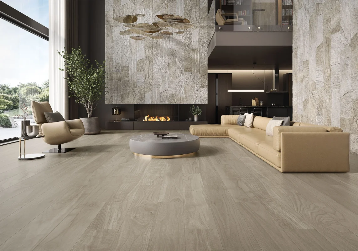 Le carrelage imite aujourd’hui n’importe quel matériau noble — pierre naturelle, béton ciré, parquet bois — avec un réalisme saisissant. Vous obtenez l’esthétique sans les contraintes d’entretien.