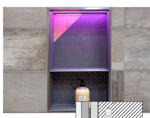 Les niches sont disponibles en différentes dimensions et couleurs de LED.Les modules LED peuvent être positionnés à l’intérieur de la niche, soit sur le bord avant, soit au milieu, soit directement sur la paroi arrière à carreler. Les modules LED sont disponibles en modèles Plug & Play de différentes longueurs, avec connecteurs. Les commandes Bluetooth compatibles avec le système ainsi que les câbles et récepteurs pour plusieurs connections sont présentés dans le tarif LIPROTEC.
