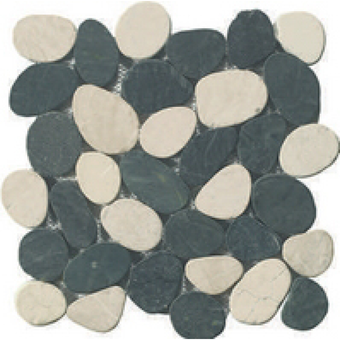 Ce modèle mêle habilement le blanc pur du “bianco” et la profondeur élégante du “nero”, pour créer une ambiance à la fois minérale, luxueuse et visuellement riche. Les petites tesselles ou galets (cailloux) contrastent délicatement entre les teintes claires et foncées, résultant en un décor dynamique, texturé et vivant.
